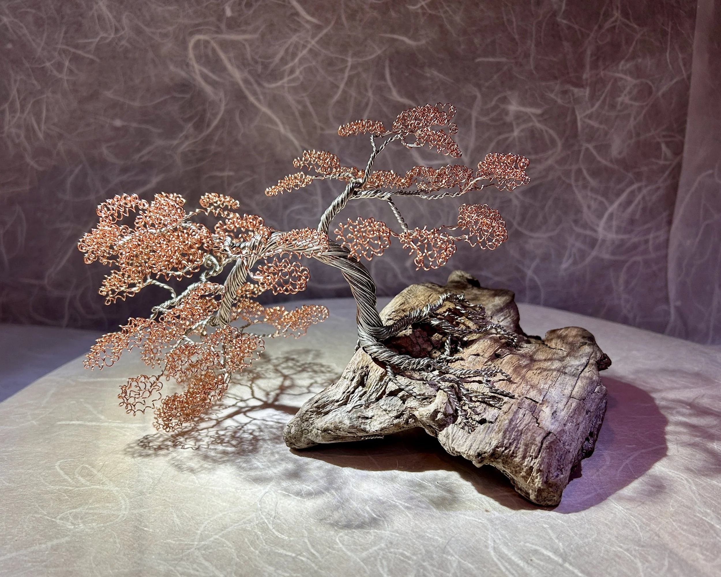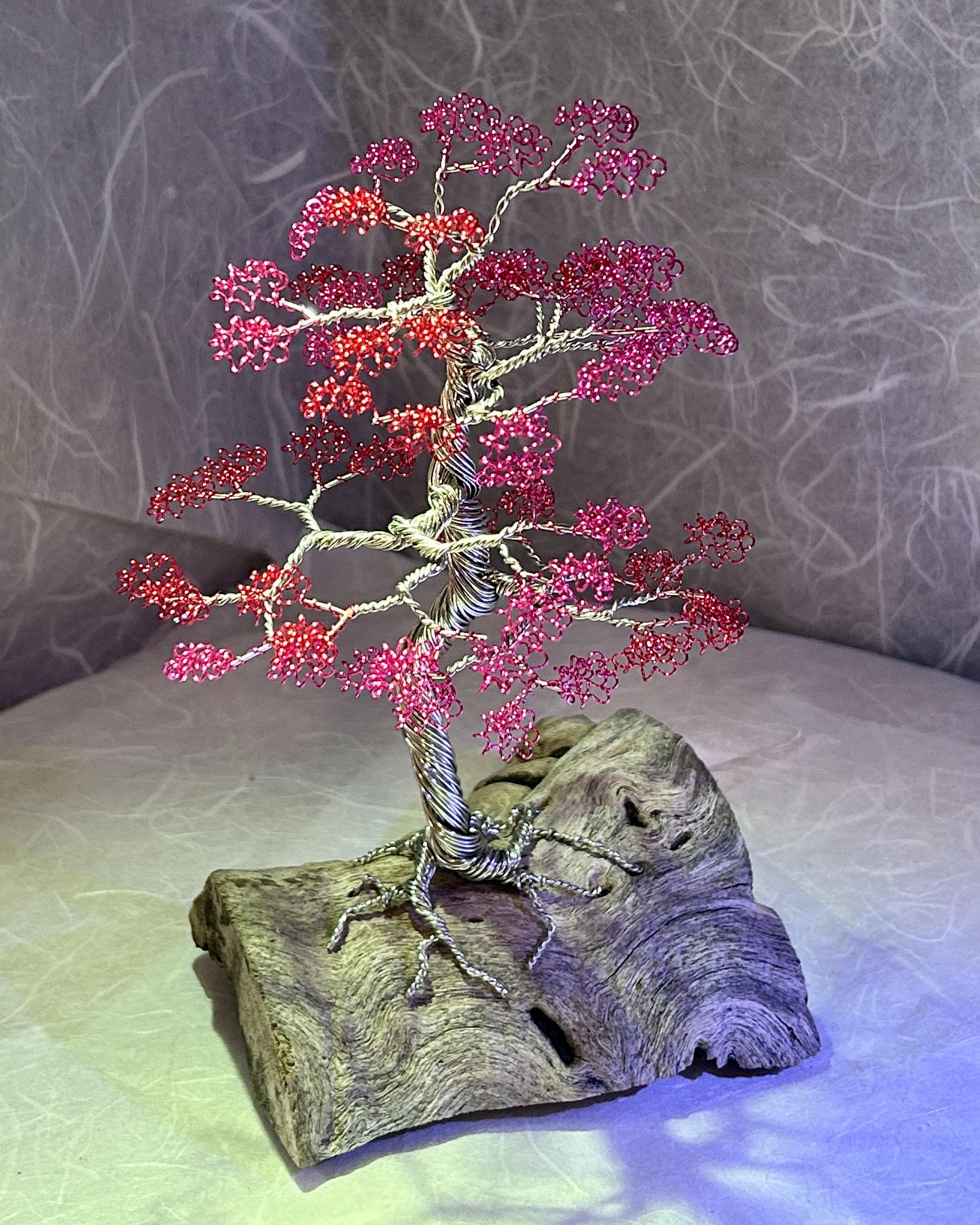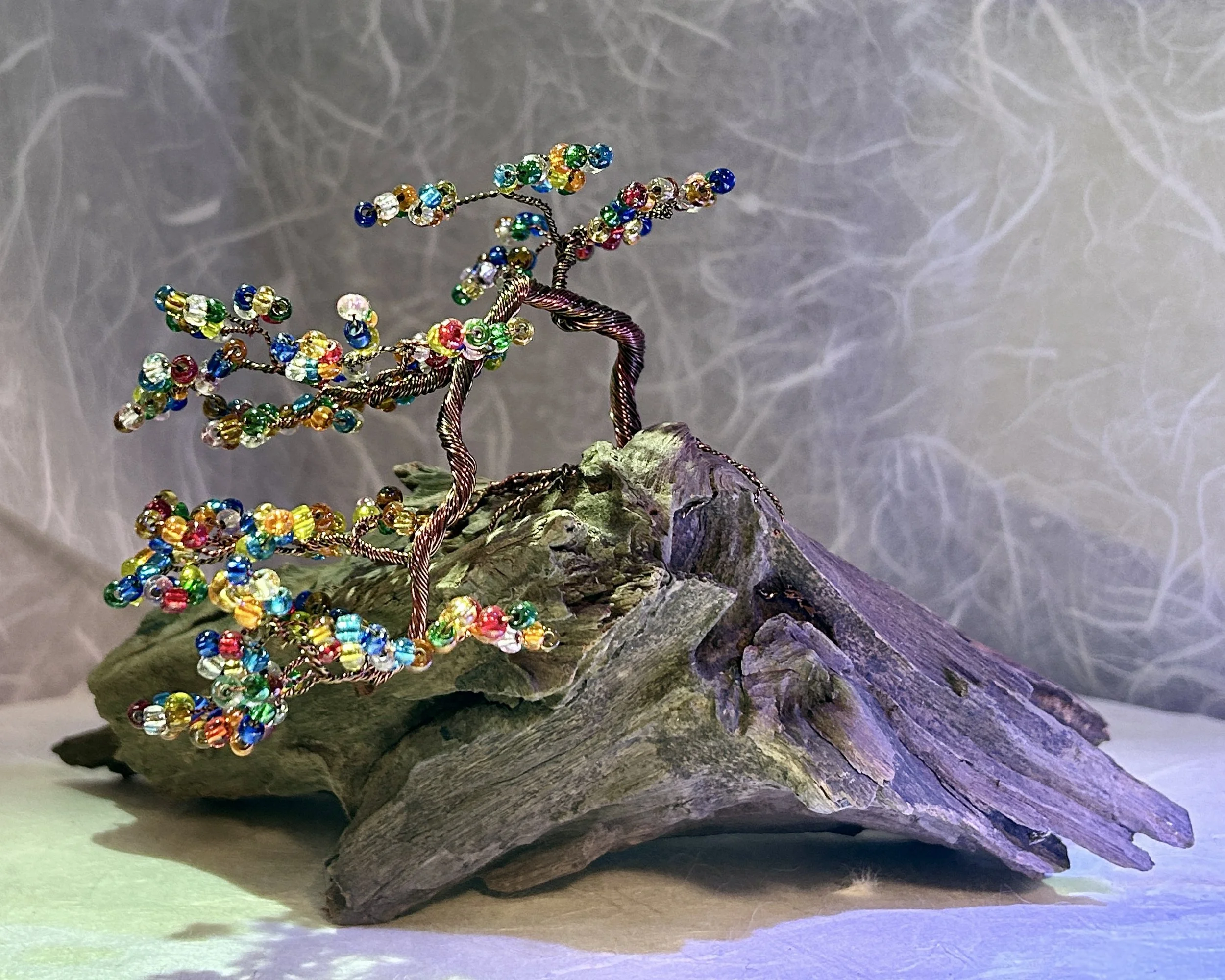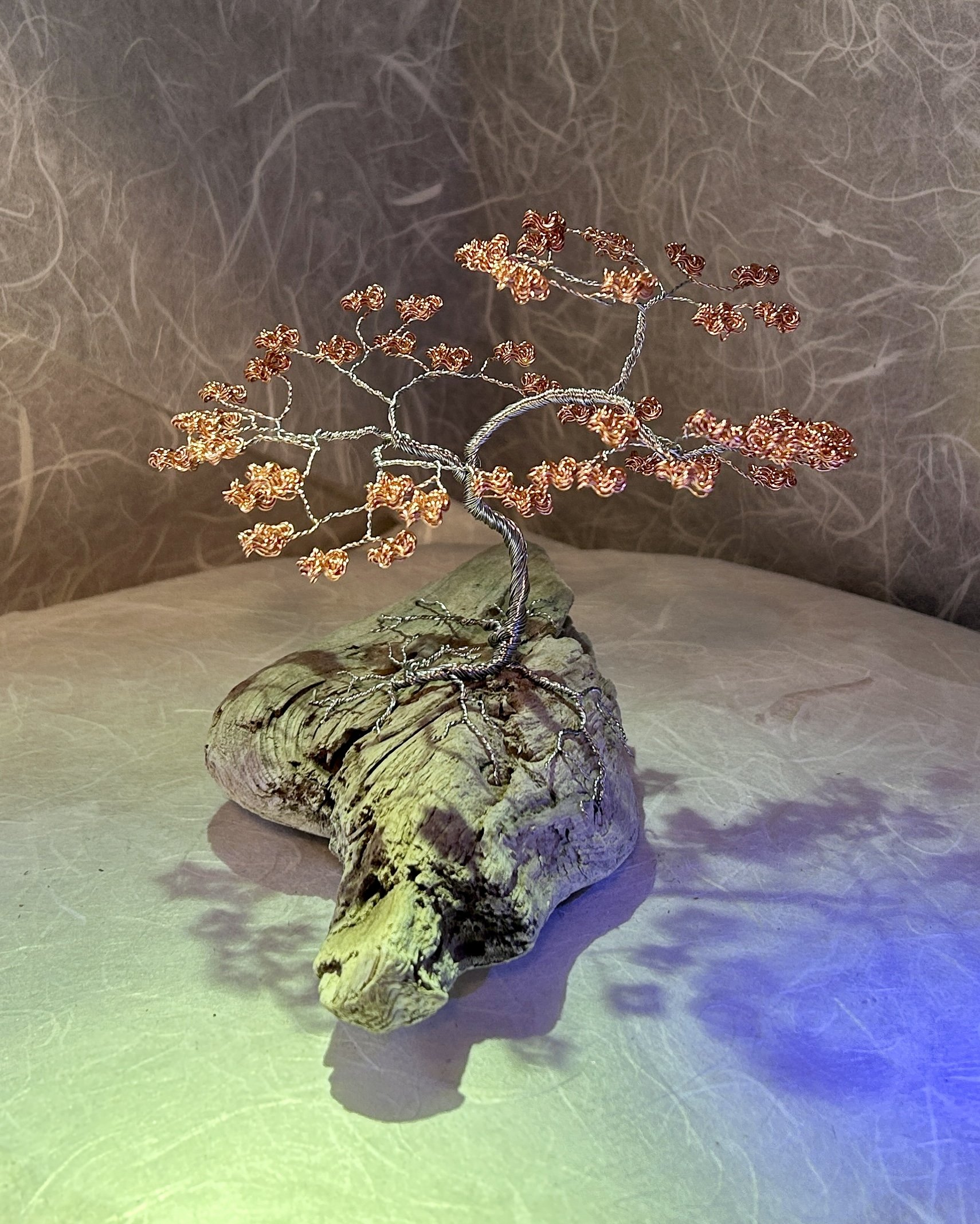 Each tree is a unique piece of art that begins by entwining many lengths of wire to create the trunk and branches. Leaves of various colors and shapes are independently created and twisted into place. Lastly, each tree is attached to a piece of weathered driftwood and meticulously adjusted to create the final product.