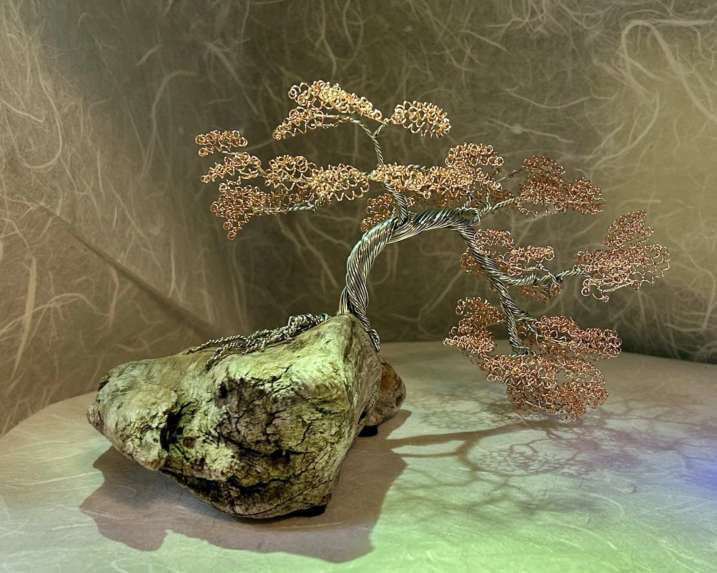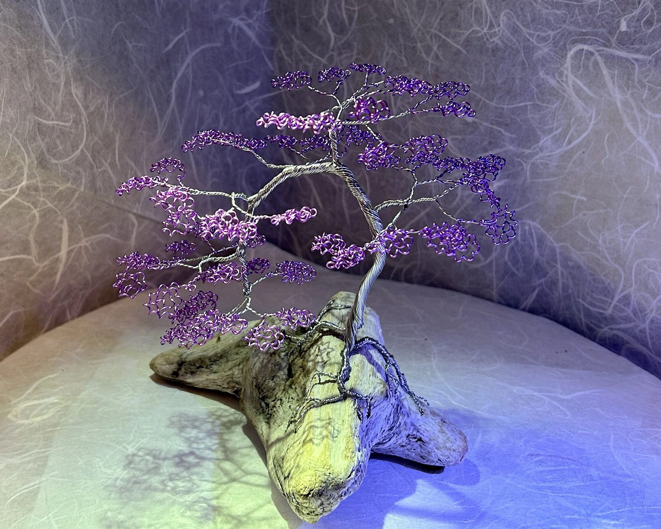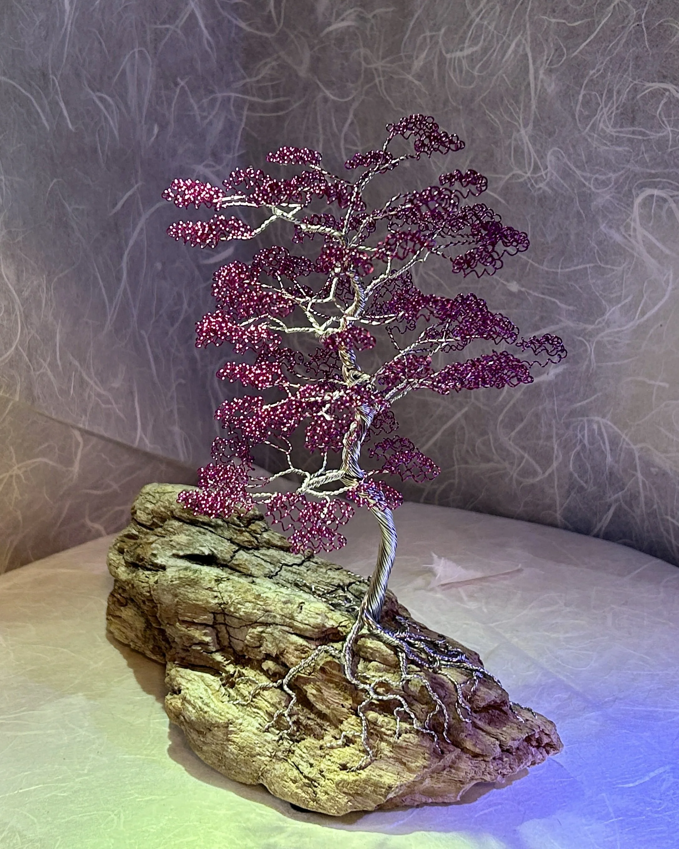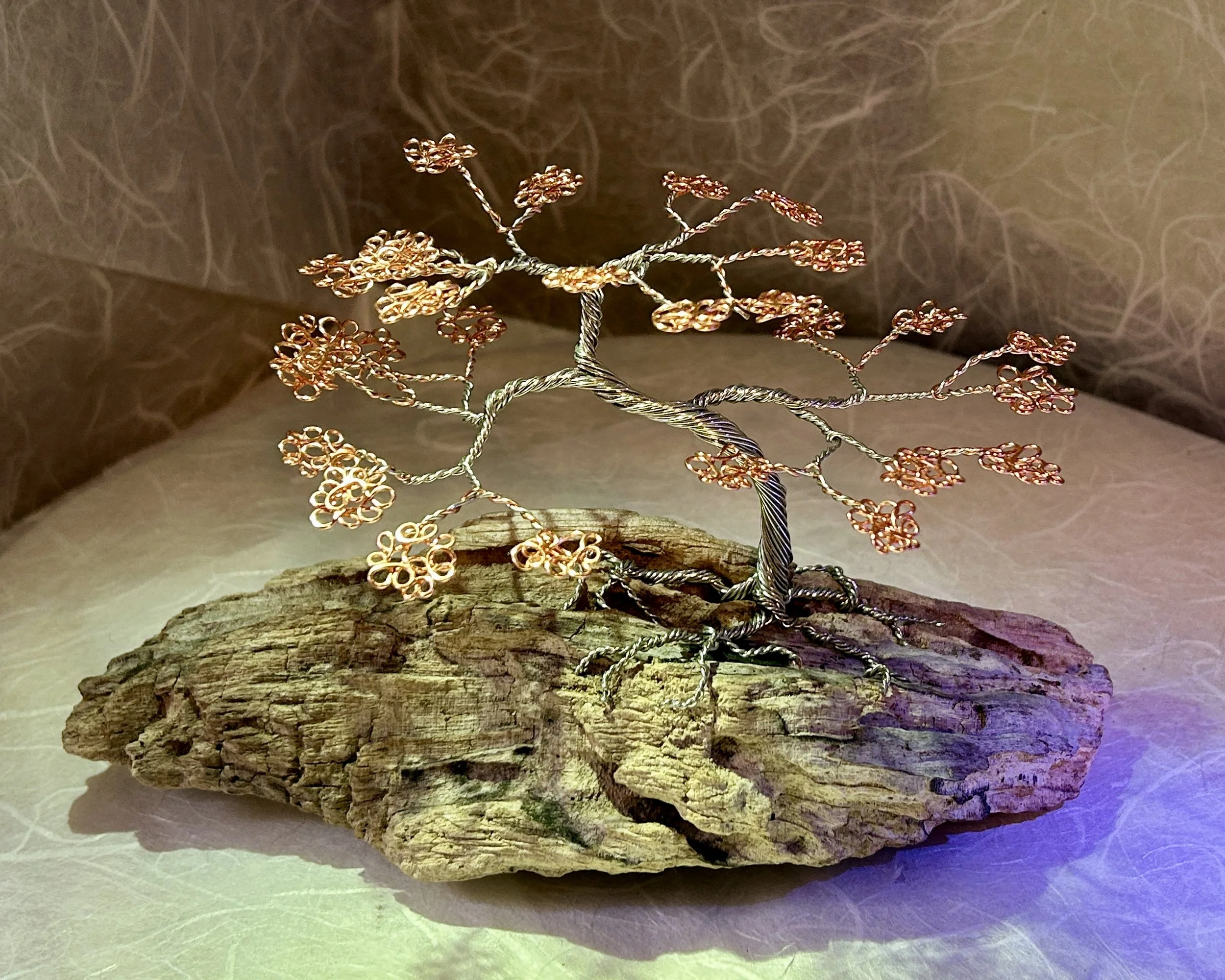 Each tree is a unique piece of art that begins by entwining many lengths of wire to create the trunk and branches. Leaves of various colors and shapes are independently created and twisted into place. Lastly, each tree is attached to a piece of weathered driftwood and meticulously adjusted to create the final product.