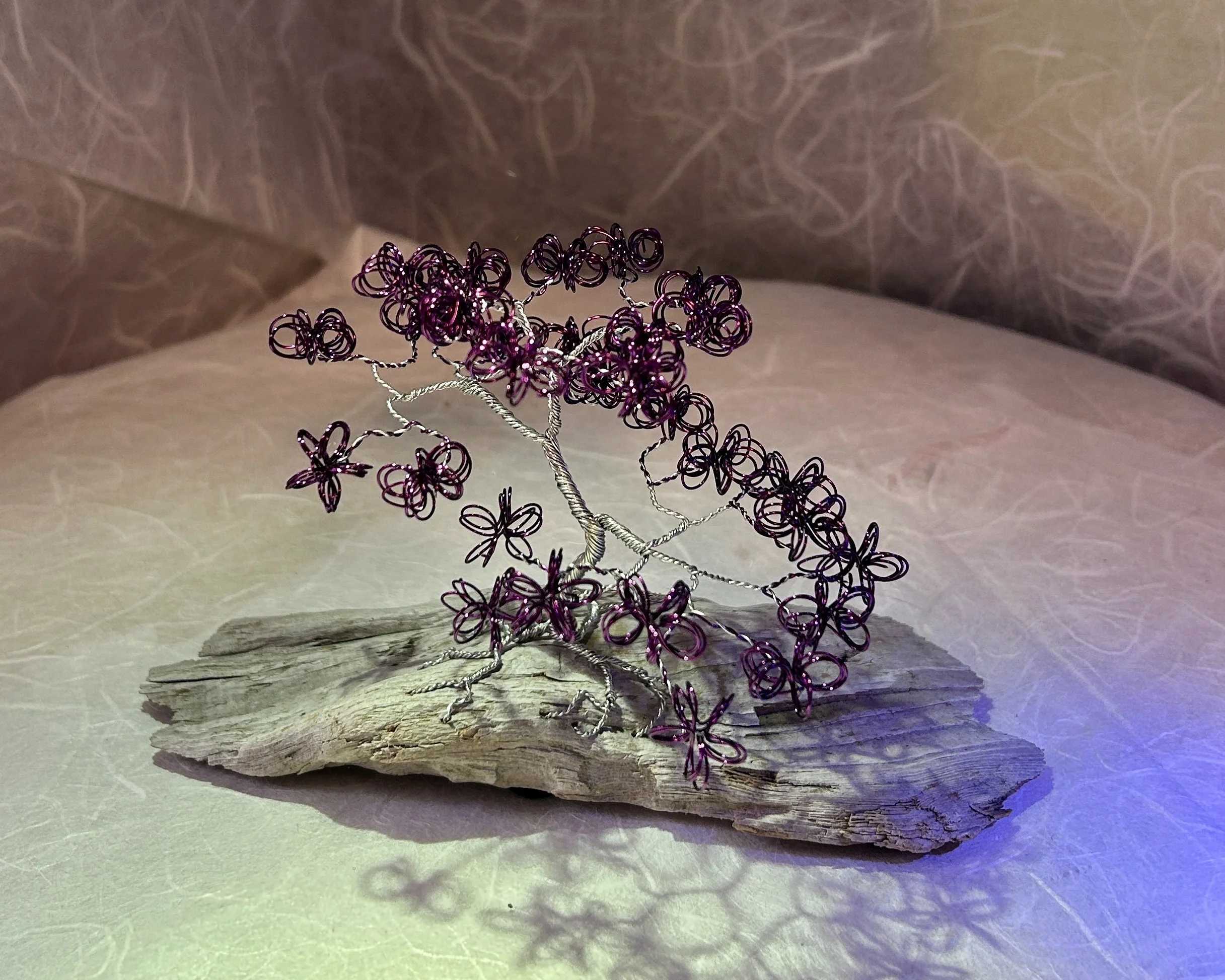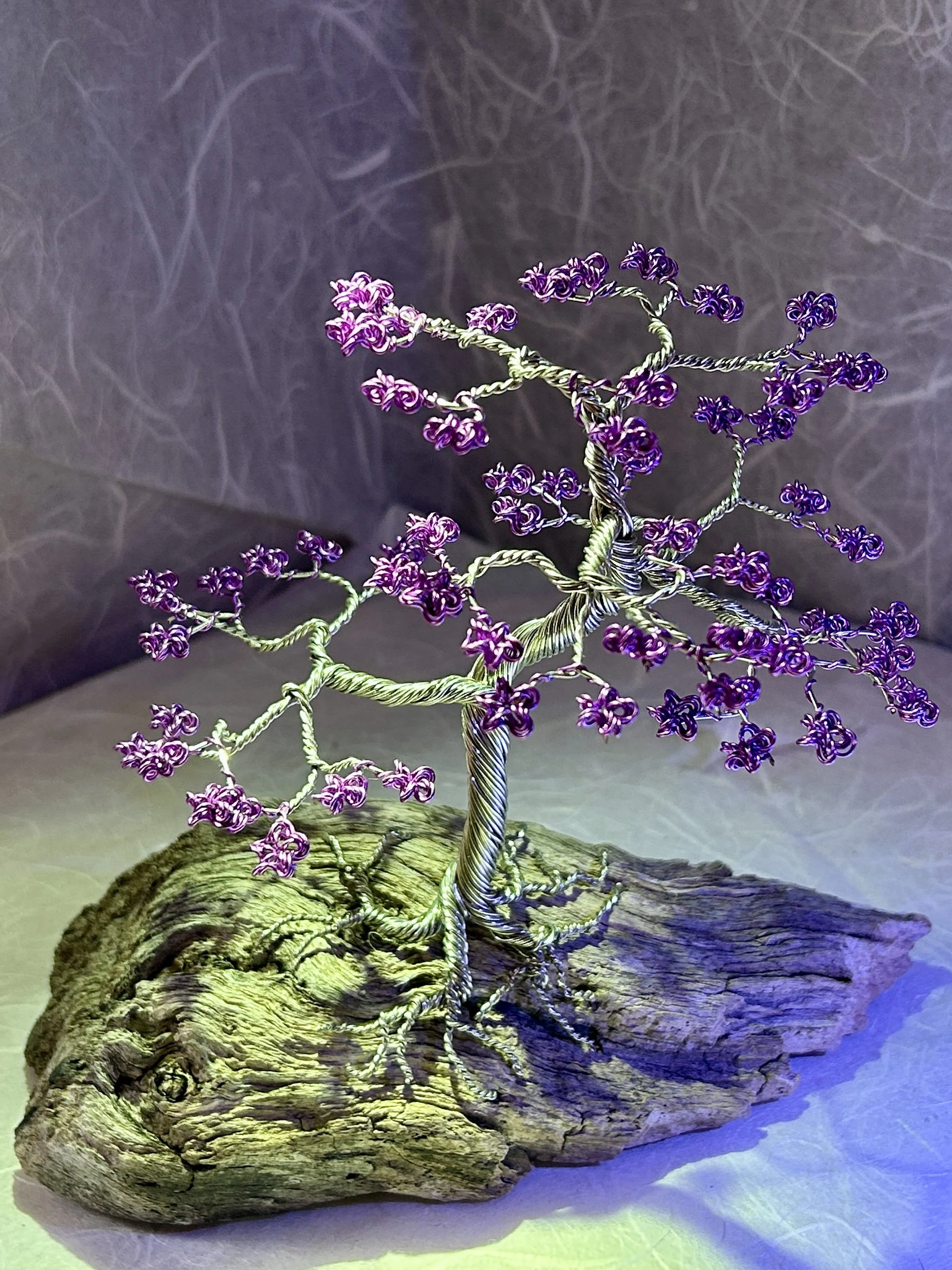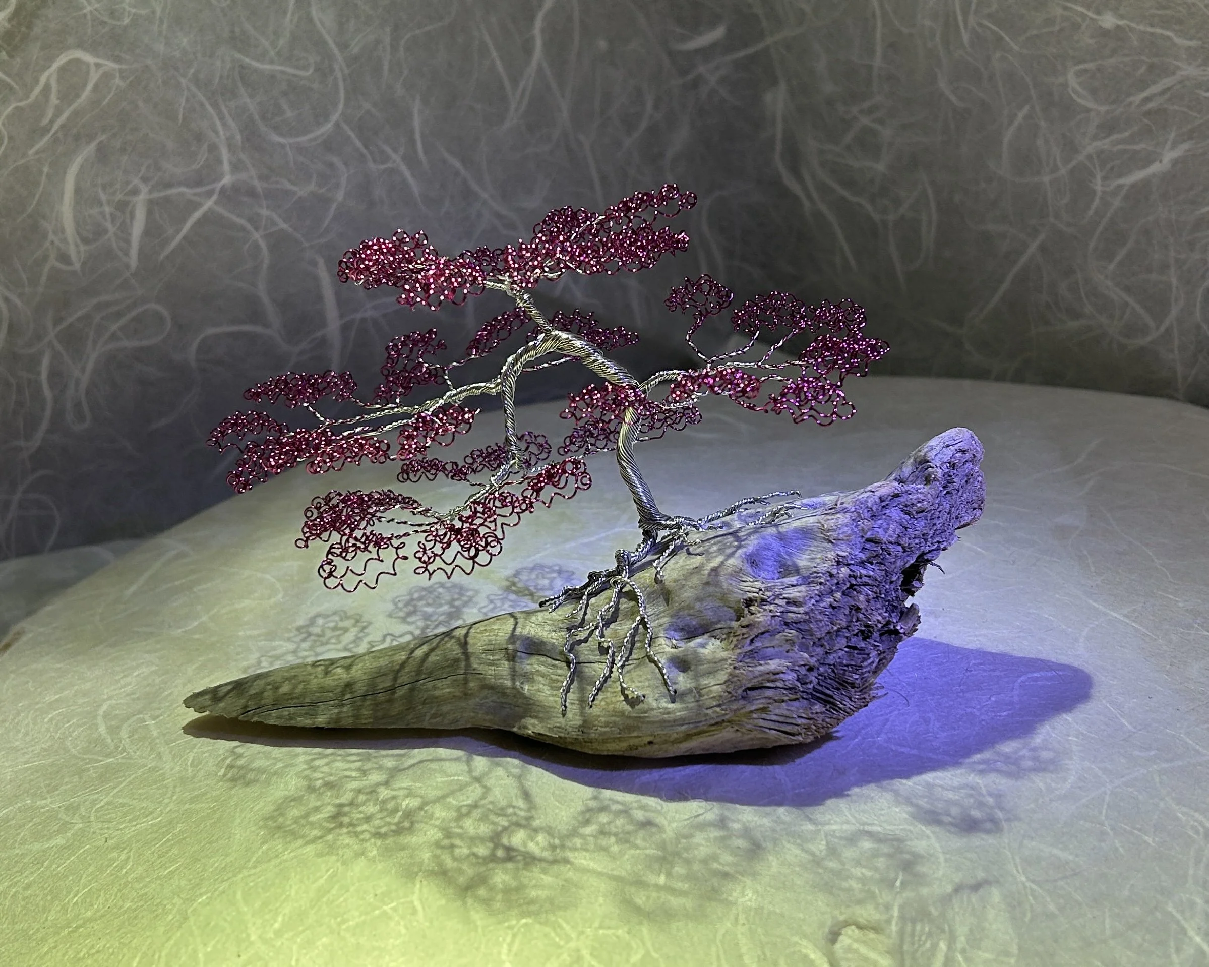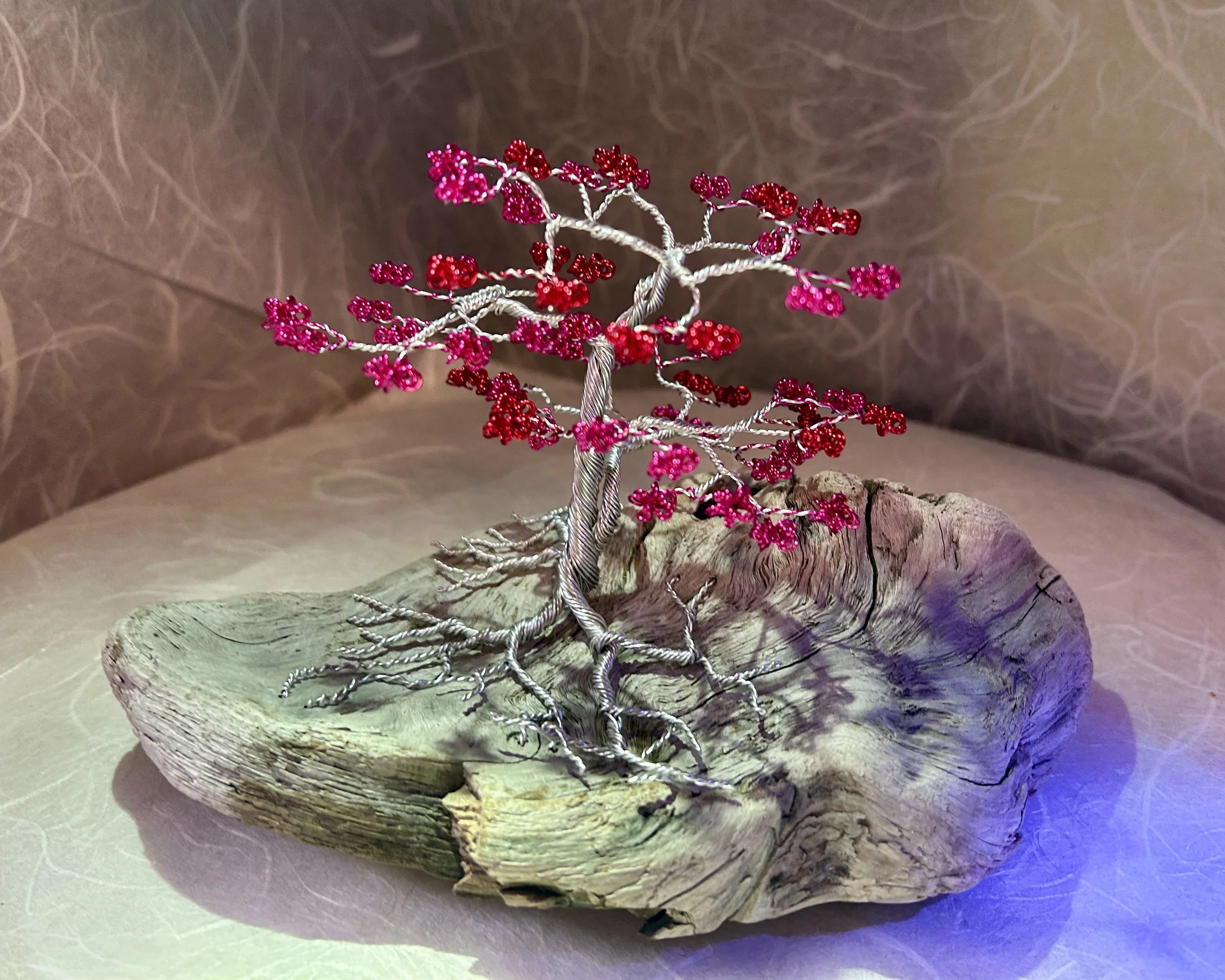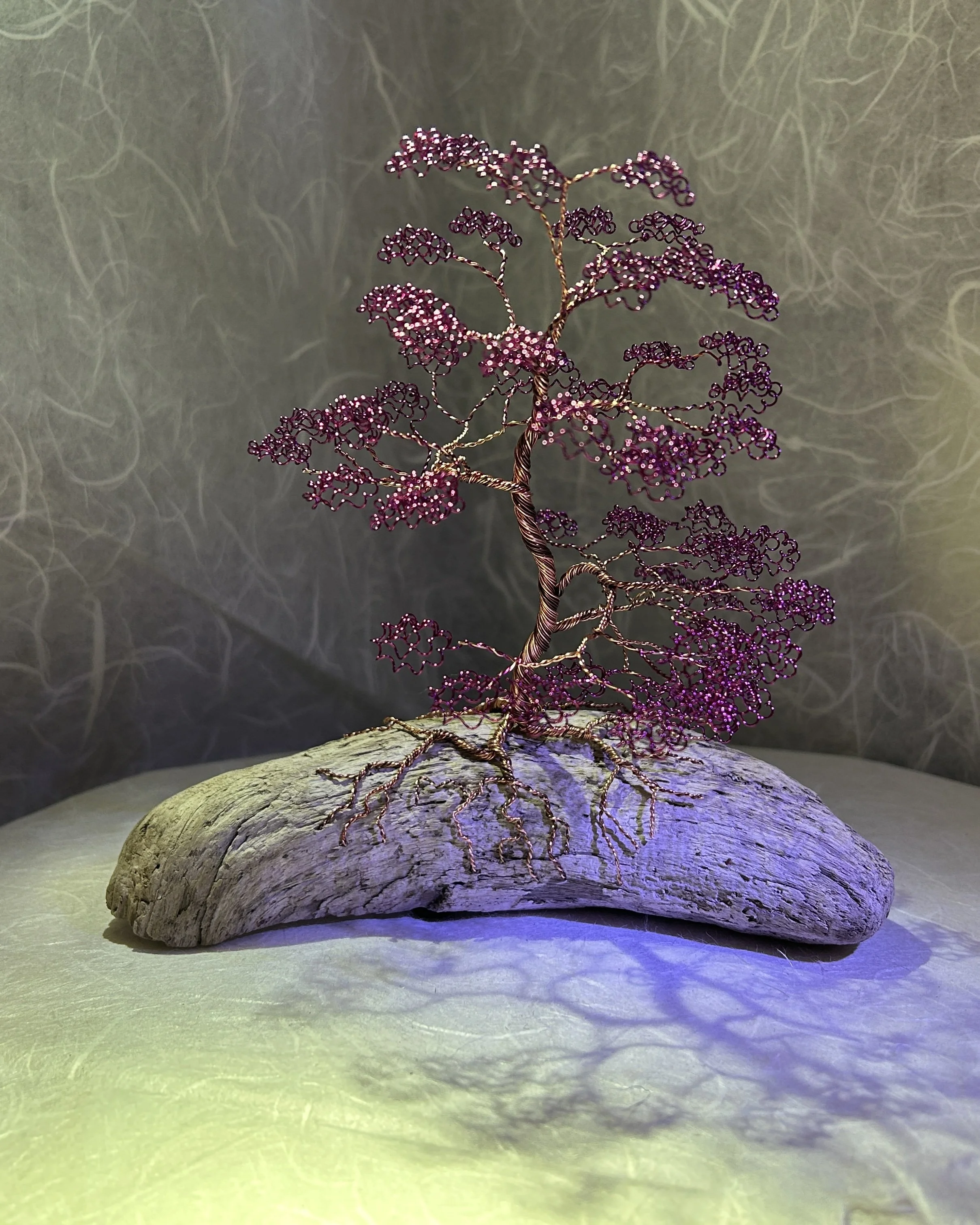 Each tree is a unique piece of art that begins by entwining many lengths of wire to create the trunk and branches. Leaves of various colors and shapes are independently created and twisted into place. Lastly, each tree is attached to a piece of weathered driftwood and meticulously adjusted to create the final product.