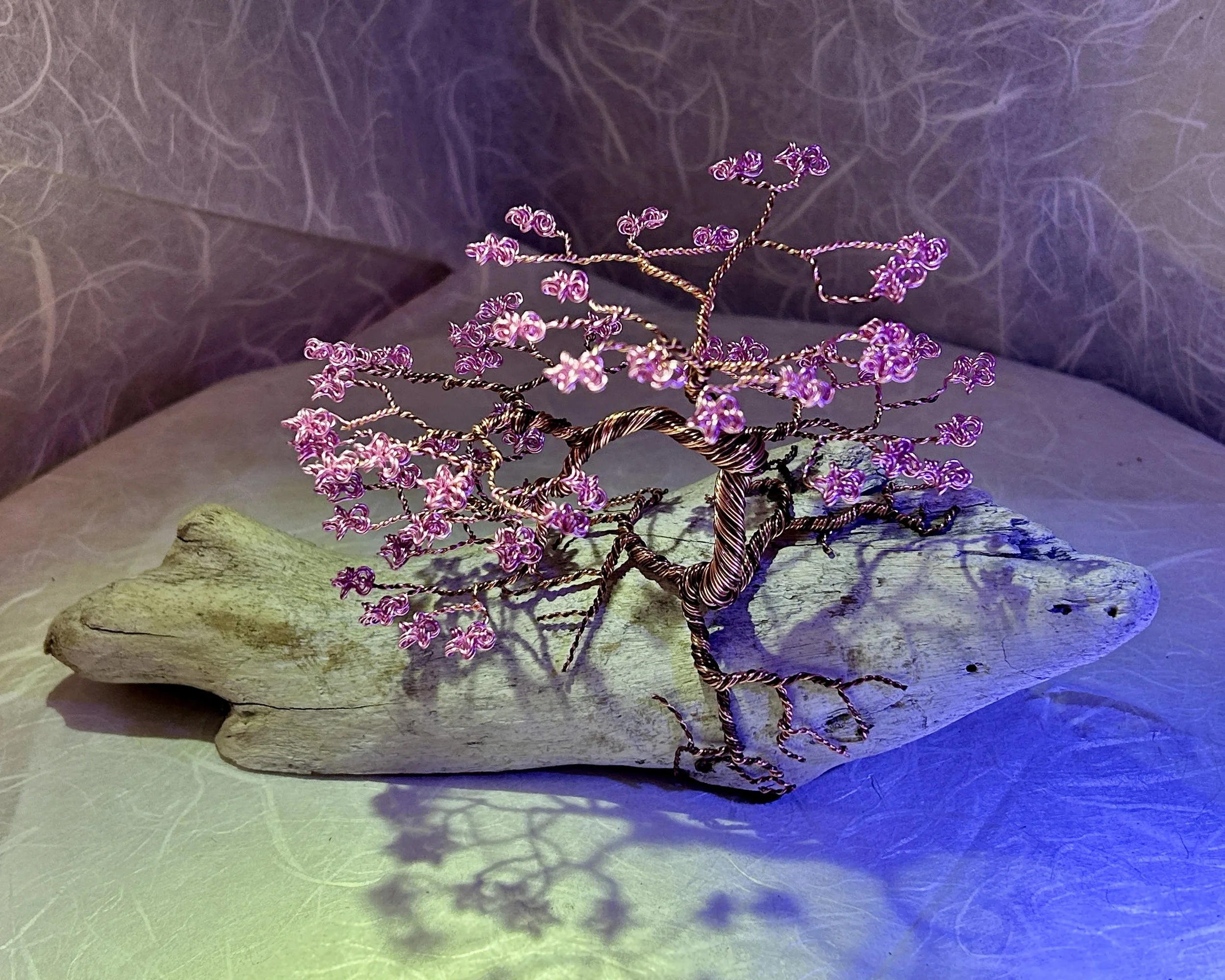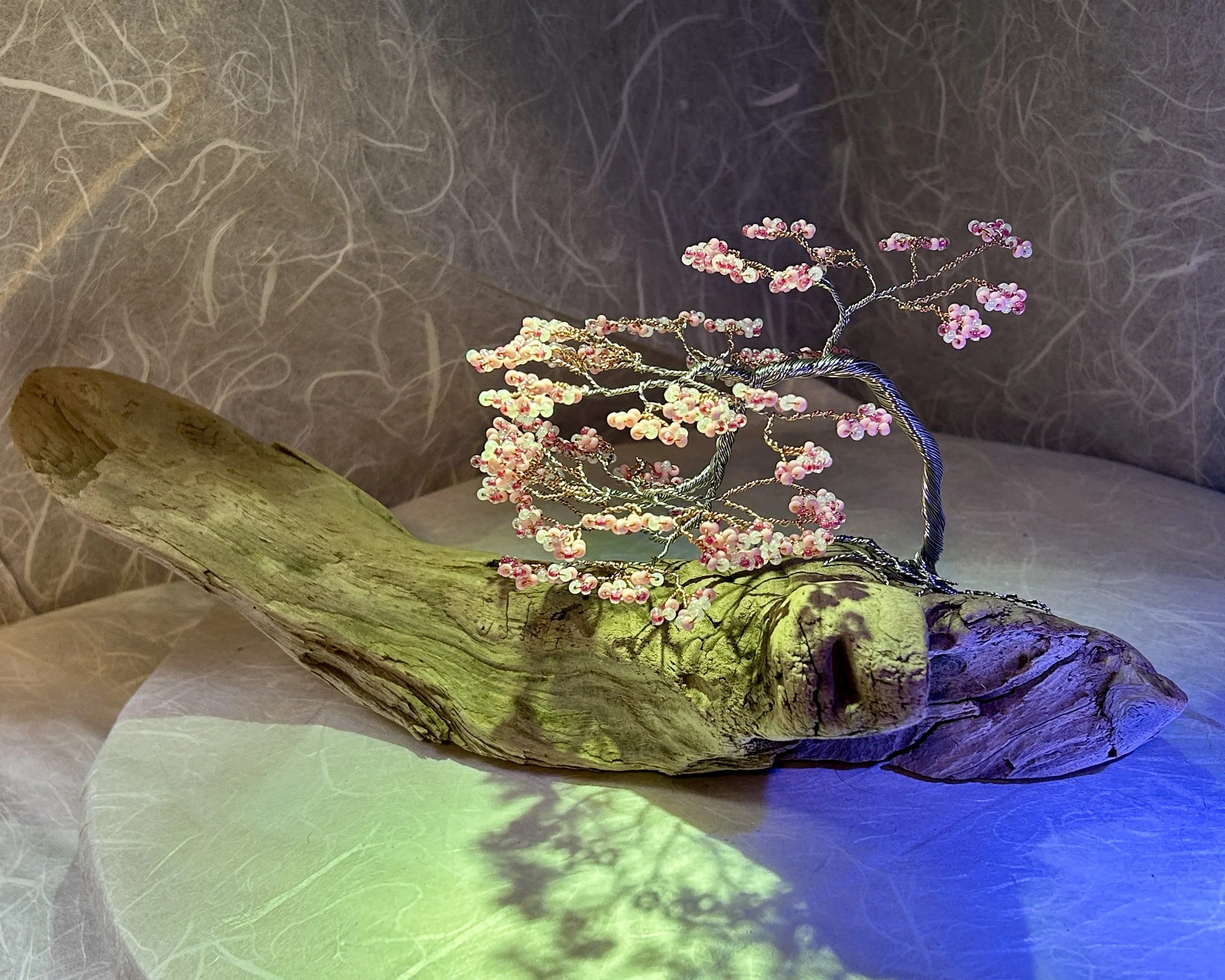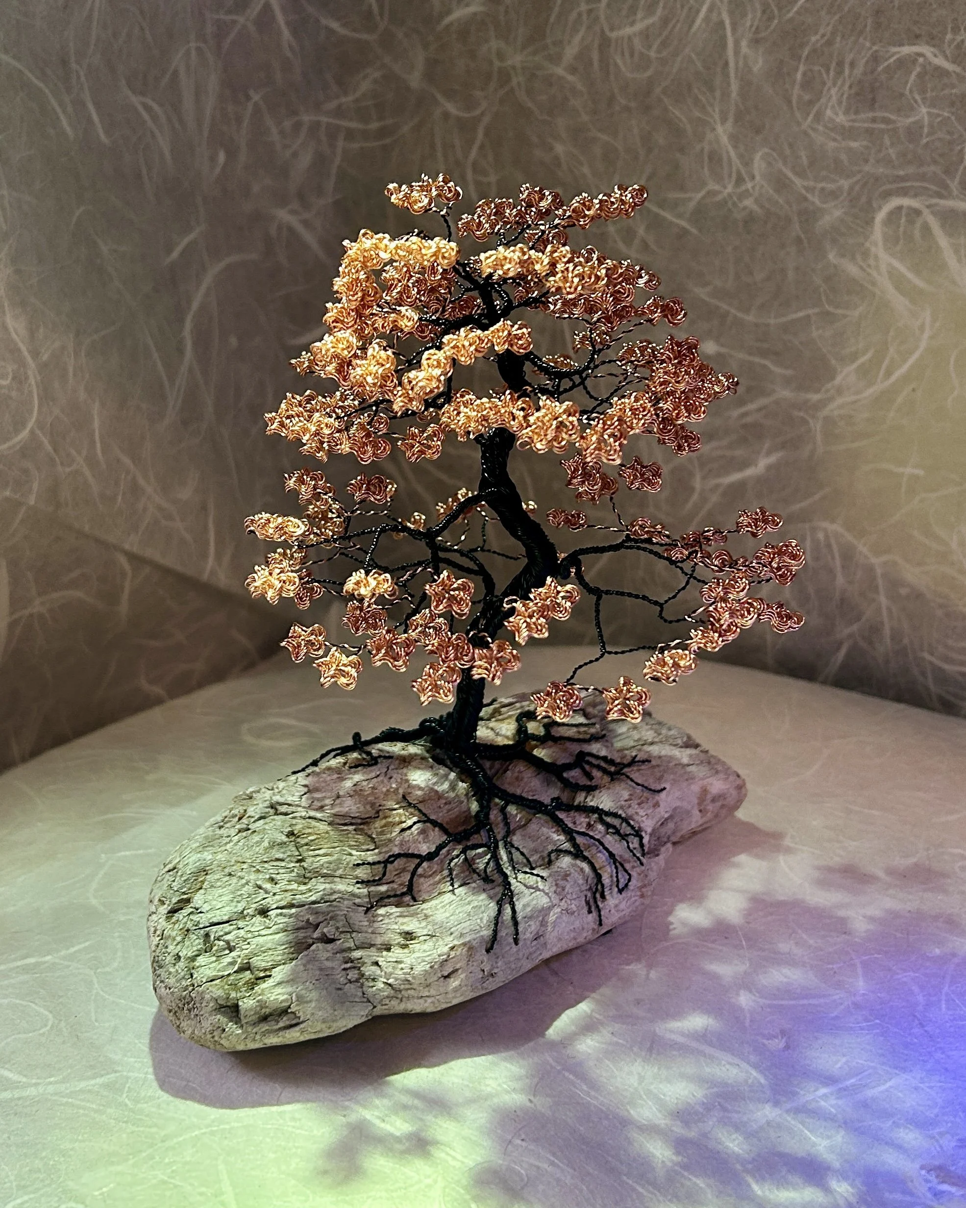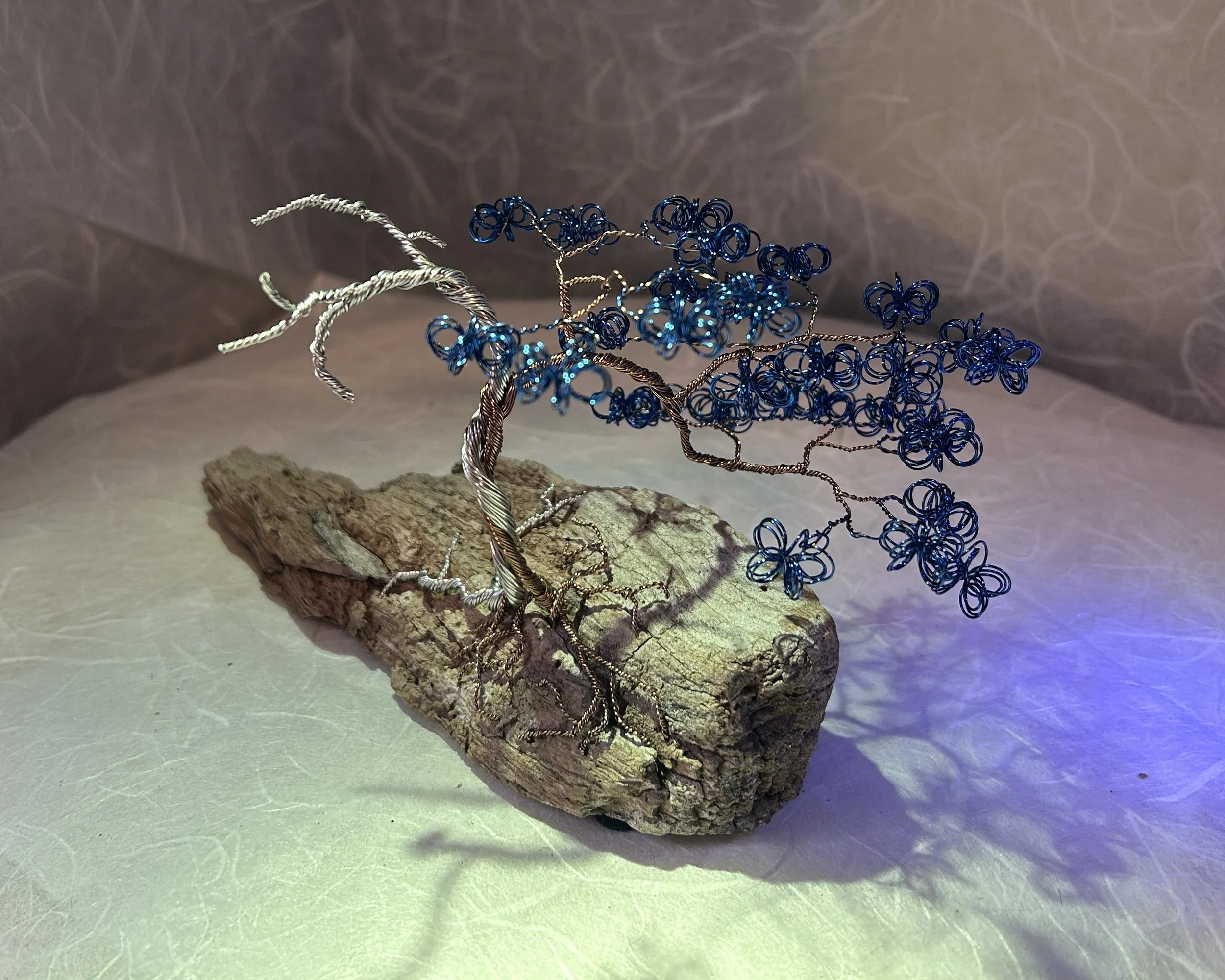 Each tree is a unique piece of art that begins by entwining many lengths of wire to create the trunk and branches. Leaves of various colors and shapes are independently created and twisted into place. Lastly, each tree is attached to a piece of weathered driftwood and meticulously adjusted to create the final product.
